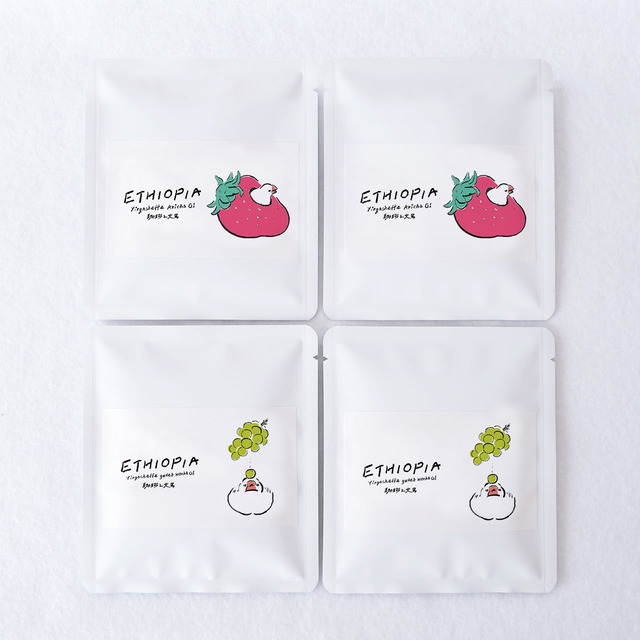 ■ 『珈琲と文鳥』シングルオリジン:浅煎りドリップバッグセット ドリップバッグ4個セット ■AMMONITE COFFEE MARKETさんとのコラボ「珈琲と文鳥」 ■シングルオリジンコーヒー ETHIOPIA- Yirgacheffe ARICHA G1 / エチオピア イルガチェフェ アリチャG1:2個 「苺つぼ巣でごきげん文鳥」 白ぶどうを思わせる瑞々しさ、いちごジャムのような甘みとベルガモットを感じるアロマ、甘酒を連想させる複雑なフレーバー。 内容量:ETHIOPIA- Yirgacheffe ARICHA G1:(8g/1個)×2個 焙煎度合い:ミディアムロースト(浅煎り) 生産者:アシュァレウ ギルマ / シャキッソ 地 域:エチオピア、グジ地区 品 種:在来品種 精 製:ナチュラル 賞味期限:焙煎日より二ヶ月 ■シングルオリジンコーヒー ETHIOPIA- Yirgacheffe gedeb worka G1/ エチオピア イルガチェフェ ゲデブ ウォルカ:2個 「マスカットときょとんとした文鳥」 グレープフルーツのような爽やかな酸味と、白ぶどうや洋梨のような甘み。 フローラルな香りと紅茶のような余韻。 内容量:ETHIOPIA- Yirgacheffe gedeb worka G1:(8g/1個)×2個 焙煎度合い:ミディアムロースト(浅煎り) 生産者:小農家 地 域:イルガチェフェ ゲデブ ウォルカ 品 種:在来品種 精 製:ウォッシュト 賞味期限:焙煎日より二ヶ月 ■アンモナイトコーヒーマーケット 日常のコーヒースタイルをデザインするスペシャルティコーヒーの専門店です。コーヒー豆の販売をメインに様々な抽出方法でスペシャルティコーヒーの奥深さを提案し生活の中のコーヒーをトータルにプロデュースするショップです。 ■ご予約受付期間 ~ 2月15日(日)23:59まで ■発送 2月19日(木)~2月22(日) 上記の期間に発送いたします。 ■配送について クリックポストでお送りします。 ※ドリップバッグセット 3個まで:クリックポストでお送りできます。 ※ドリップバッグセット 4個以上:合計で4個以上ご購入の場合は「レターパック」をお選びください。 ※【お選びいただいた配送方法でお送りすることが出来ない場合】 別途「ゆうパック」または「レターパックプラス」の追加購入のご連絡をしますので、予めご了承ください。 ※他の商品もご購入の場合 珈琲とグッズをご購入いただいた方は、 珈琲の発送期間に合わせてお送りしますので予めご了承ください。 ■ご注意ください(鳥をはじめ動物と暮らしている方へ) 人間が飲む珈琲ですので動物が飲まないようにご注意ください。 また、動物が安全な環境にいることを確認してから珈琲をお楽しみください。