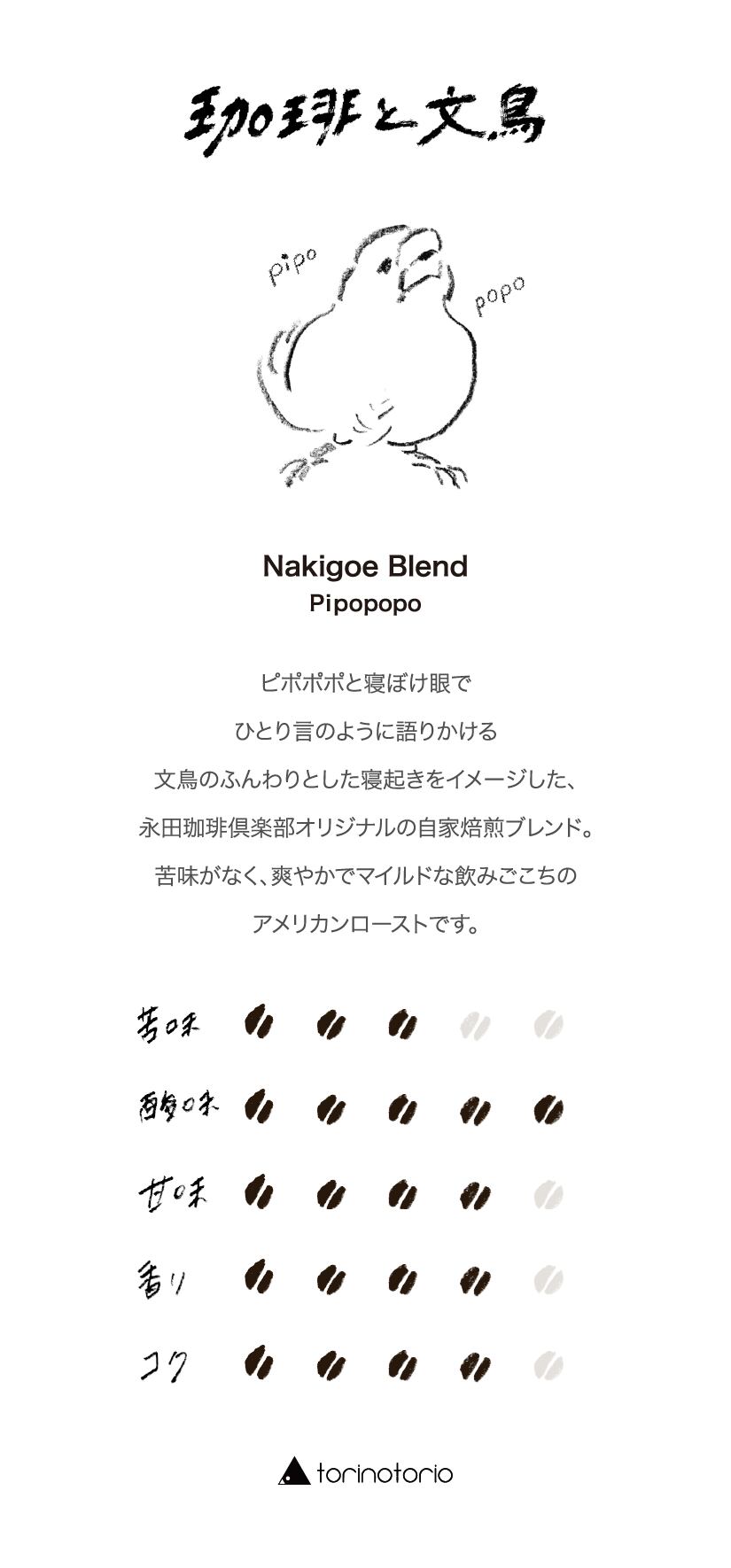 ピポポポと寝ぼけ眼でひとり言のように語りかける文鳥のふんわりとした寝起きをイメージした、永田珈琲倶楽部オリジナルの自家焙煎ブレンド。